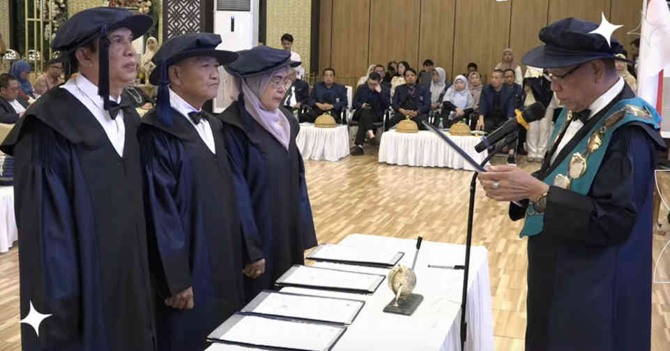 Tiga akademisi yang resmi menyandang gelar guru besar yakni Prof. Ir. Andi Tenri Fitriyah, M.Si., Ph.D., Prof. Dr. Cahyono, S.E., M.Si., serta Prof. Ir. Baharuddin, M.Si., Ph.D.