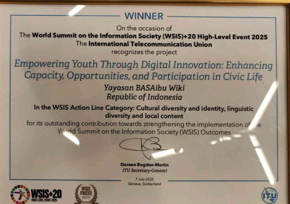 Jenewa, Swiss — Inisiatif digital asal Indonesia, BASAibu, meraih penghargaan Winner (Pemenang Utama) dalam ajang bergengsi WSIS Prizes 2025, untuk kategori Cultural and Linguistic Diversity Through Youth Digital Engagement.
