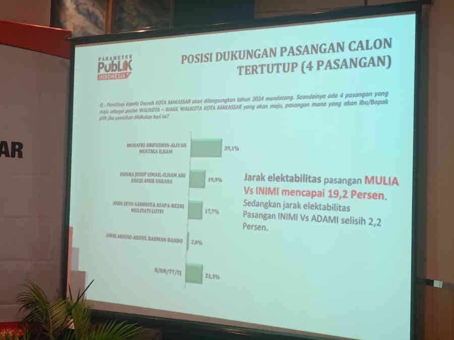 Hasilnya, pasangan Munafri Arifuddin – Aliyah Mustika Ilham (MULIA) semakin kokoh dengan meraih elektabilitas 39,1% unggul 19% dari tiga (3) Pasangan calon lainya.