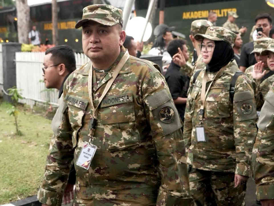 Ia mengenakan seragam komponen cadangan (Komcad) Tentara Nasional Indonesia (TNI) berwarna loreng hijau, lengkap dengan perlengkapan taktis.