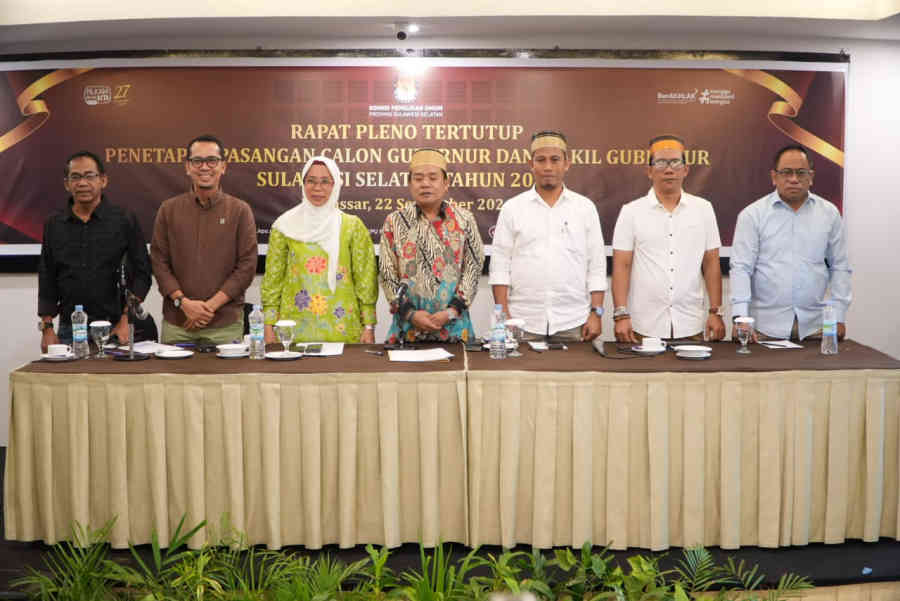 MAKASSAR – Komisi Pemilihan Umum (KPU) Provinsi Sulawesi Selatan (Sulsel) menetapkan dua pasangan calon untuk Pemilihan Gubernur dan Wakil Gubenur Sulsel pada rapat pleno tertutup di Hotel Claro Makassar, Minggu 22 September 2024.
