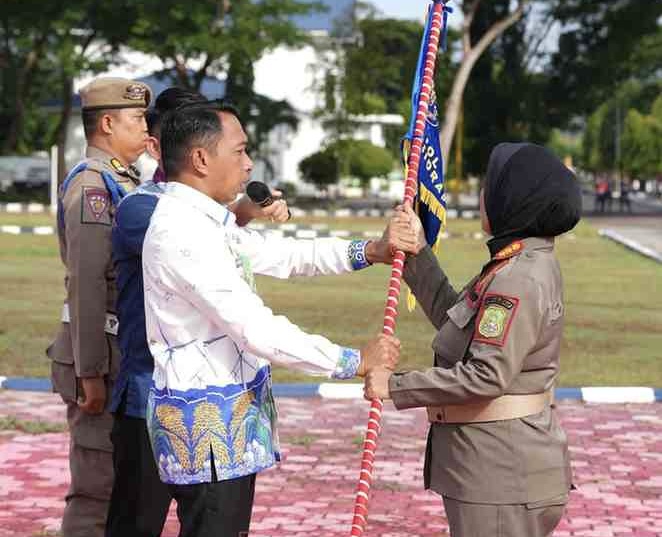 Syaharuddin menyerahkan bendera kepada Plt Kasatpol PP dan Damkar Sidrap, Andi Gustianti, sebagai tanda pelepasan.