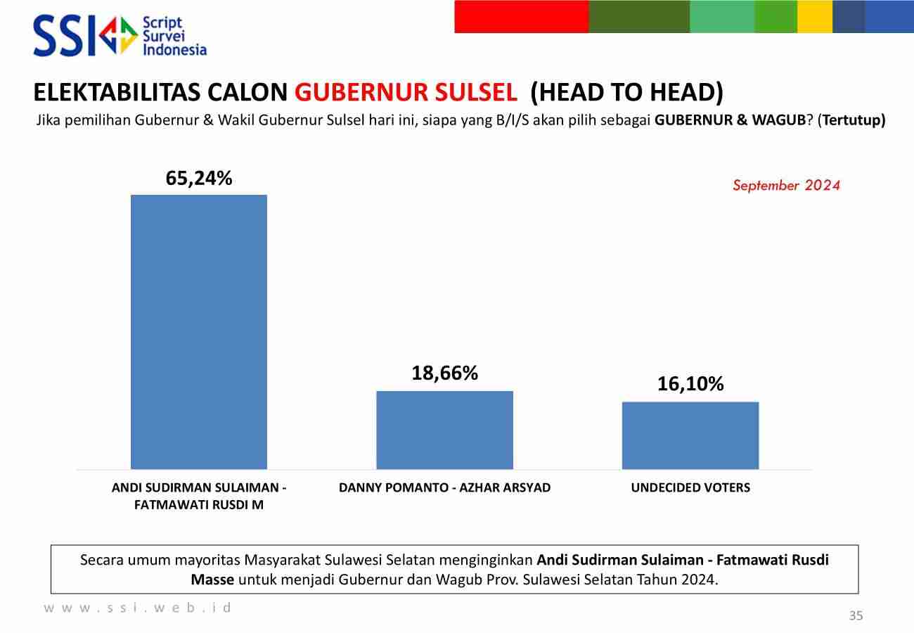 Dalam survei ini, SSI menyimpulkan bahwa keunggulan telak paslon nomor urut 2, Andalan Hati karena selain petahana juga karena masyarakat Sulsel merasa puas dengan kinerja mantan Gubernur Sulsel, Andi Sudirman.
