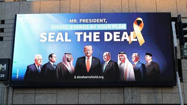 Sebelumnya, foto-foto baliho tersebut diposting oleh akun X, @AbrahamShield25, yang memuat gambar Presiden Prabowo, bersama dengan pemimpin dunia lainnya seperti Presiden Uni Emirat Arab (UEA) Mohammed bin Zayed Al-Nahyan, Raja Yordania Abdullah II, Putra Mahkota Arab Saudi Mohammad bin Salman (MBS), Presiden Mesir Abdel Fattah el-Sisi, dan Presiden Palestina Mahmoud Abbas. Presiden Amerika Serikat (AS) Donald Trump juga tampak di foto tersebut.